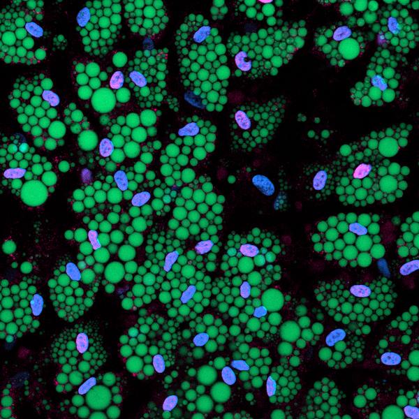 Confocal fluorescent micrograph of human adipose stem/precursor cells (ASPCs) differentiated into white adipocytes in vitro. Accumulated lipid droplets are visualised in green by Bodipy staining and nuclei in blue with Hoechst. Pink staining shows the presence of the adipogenic transcription factor (CEBPβ), activation of which gives rise to adipogenic phenotype, which here is visualised by the intensity of the CEBPβ signal. (EPFL / Laboratory of Systems Biology & Genetics / Magda Zachara.)